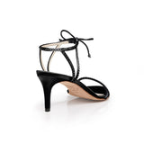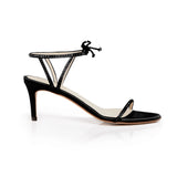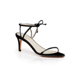 Handcrafted from biologic silk, apple skin and bio-based sugarcane molasses, Clover reimagines the classic luxury heeled sandal with hand-stitched glass crystals. Clover is a black rounded-toed style with an adjustable, smooth ankle strap and a 75MM heel. Handmade in Italy.