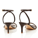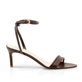 Handcrafted from water resistant, luscious apple skin, Lilla Espresso is a dark brown open toed fitted 75MM sandal heel with smooth, adjustable straps. Handmade in Italy.