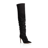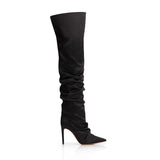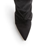 Handcrafted from biologic silk and apple skin, Primavera is a black, rouged over the knee boot with a pointed-toe fitted style and 100mm stiletto heel. The slip on style ensures the impeccable fit, comfort and versatility. Handmade in Italy.
