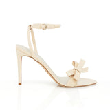 Handcrafted from water resistant, luscious apple skin, Flora Latte is a light cream open toed fitted 100MM sandal heel with hand-sewn bow detail and smooth, adjustable straps. Handmade in Italy.
