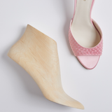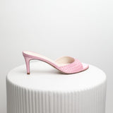 Handcrafted from biologic silk, apple skin and hand stitched glass, Plumeria Scintelle Rose is a pink rounded-toe mule with a 75MM stiletto heel. The slip on style ensures the impeccable fit, comfort and versatility. Handmade in Italy.